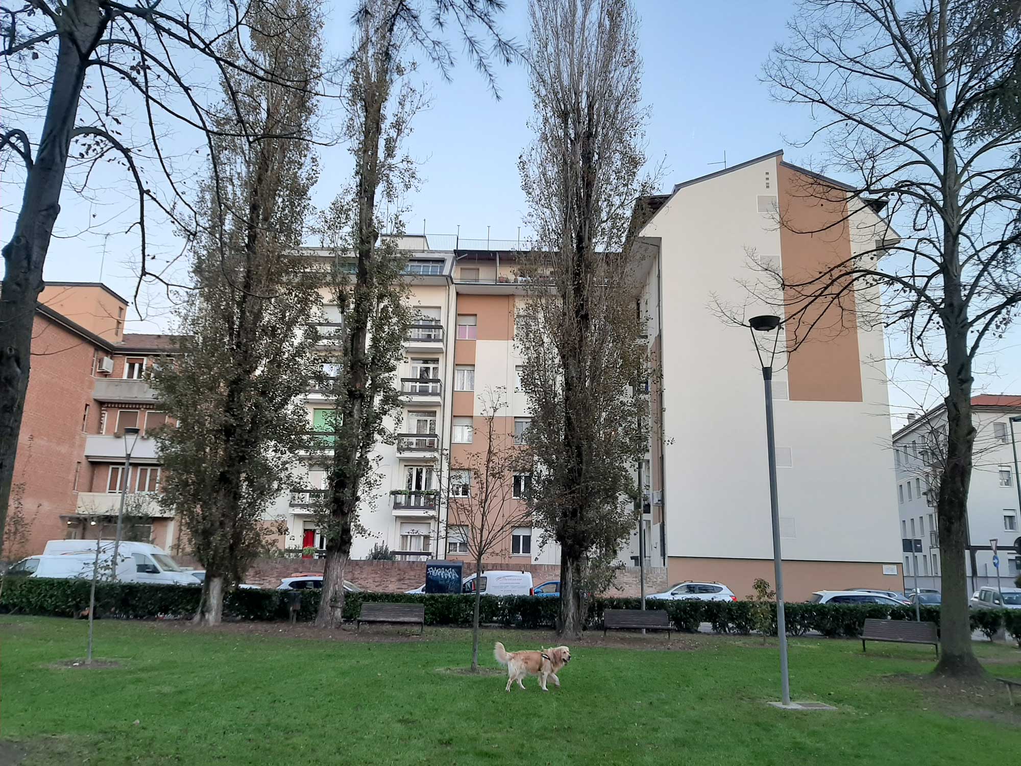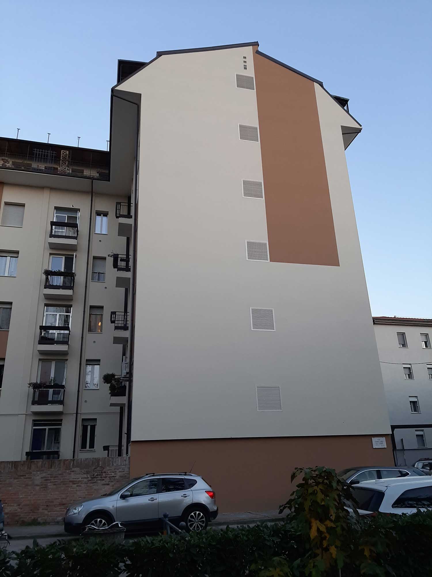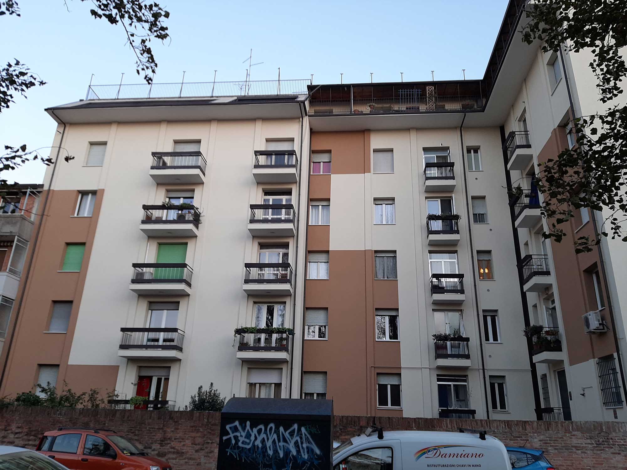 Il fabbricato è un condominio da 40 unità immobiliari sito a Ferrara, vicino all’iconica Piazza Ariostea, risalente al 1959 è stato oggetto di intervento volto all’efficientamento energetico e modernizzazione delle facciate. In particolare, l’isolamento dell’involucro e l’implementazione del sistema impiantistico, la sostituzione degli infissi esterni. È stato installato un impianto fotovoltaico e le schermature solari sul lato sud. A seguito dell’intervento i prospetti, in continuità con il tessuto edilizio esistente e circostante, sono stati progettati sulle tonalità del marrone e del beige.