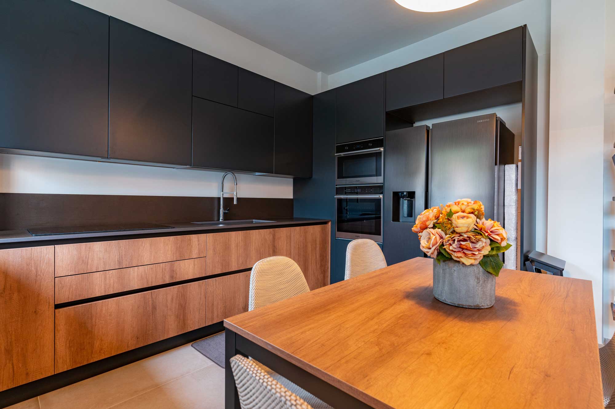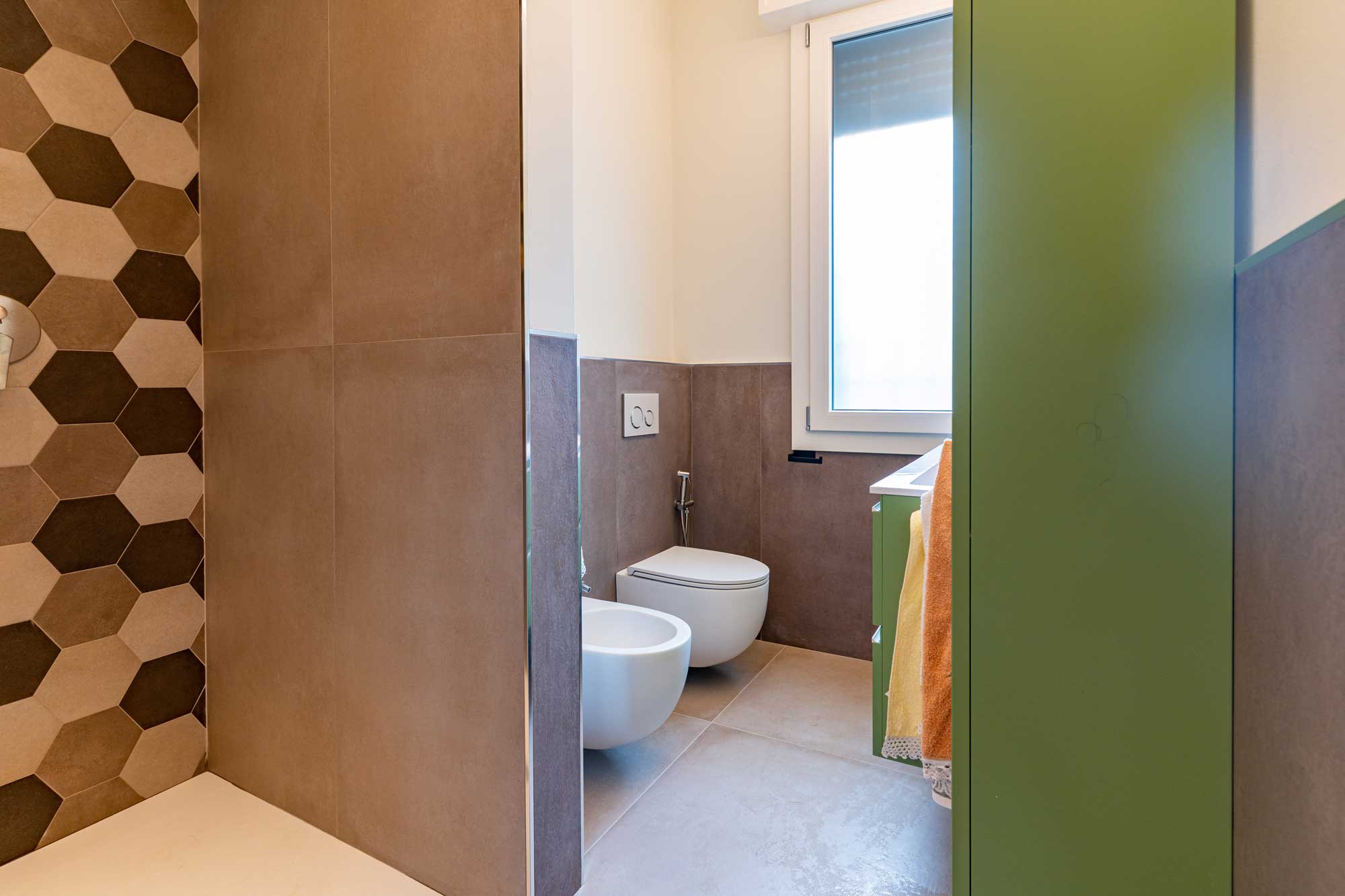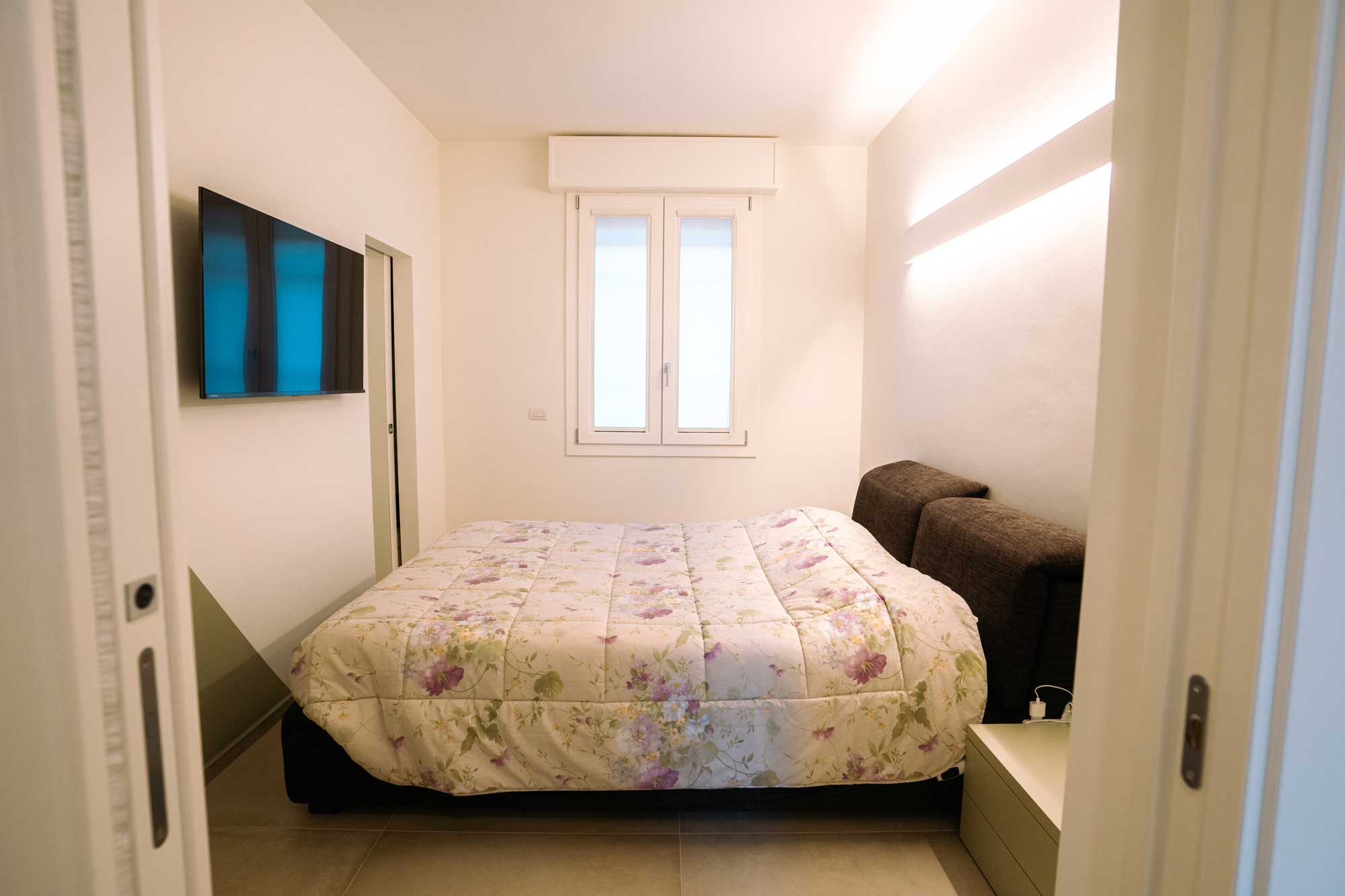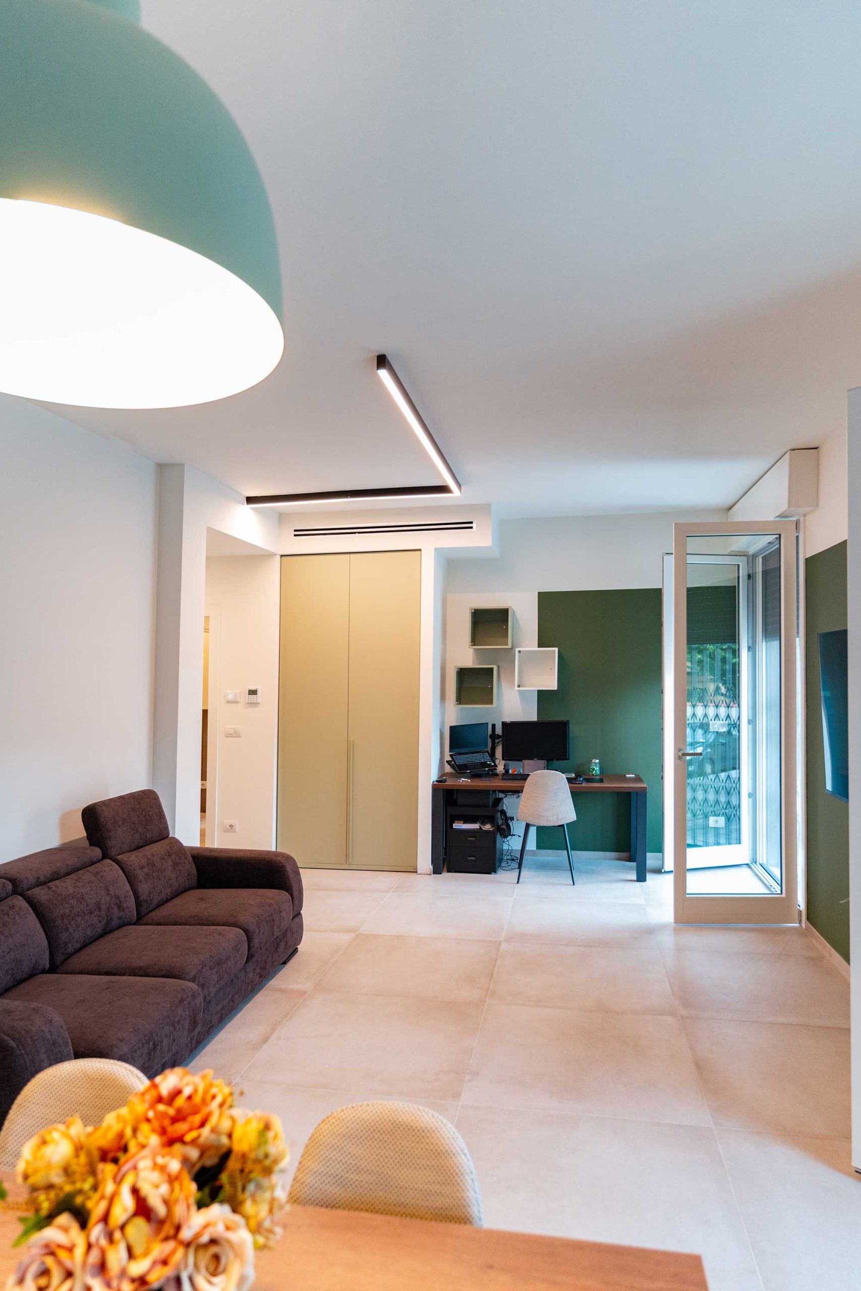 L’immobile è sito al piano rialzato di un edificio dell’edificio risalente alla fine degli anni 60, inizio anni 70, interno ad una corte e non prospicente Via Borsari. L’appartamento, libero su 3 lati, è stato oggetto di una importante manutenzione interna che ha portato alla ridistribuzione degli spazi, e ammodernamento di tutti gli impianti. Il nuovo ingresso si affaccia direttamente alla nuova zona giorno open space, dove si trovano il soggiorno e la zona cottura con penisola. Il balcone e la terrazza, prima non collegati in maniera permanete, diventano un unico spazi con gradini di collegamento. Sempre dall’ingresso si accede alla nuova zona lavanderia, dove prima si trovava la cucina, e alla zona notte.